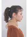 全体に波巻きにして、ミドルの高さにポニーテール。残った毛をねじりながらゴムを隠すように留める。ポイントとなる前髪は細めのコテで。