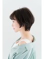 フェイスラインに沿うように前下がりボブラインのショート。重い色合いに軽いシルエットで程よく落ち着いた雰囲気に。カラー、艶感に光に当たると透けるモノトーンでカッコよく。