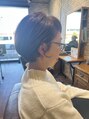 襟足はタイトに収め、丸みのあるシルエットで横顔がきれいに見えるコンパクトショート。耳かけで抜け感も出せて、メガネとも好相性。乾かして毛先を内に入れるだけでまとまります。