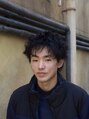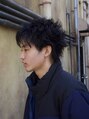 長めのツーブロックと毛先に少しスパイキーな感じを出すのに縦に鋏を入れてベースカット。前髪は大きめ、全体は少し細めにツイストを入れたスパイラルパーマで動きと遊びを。