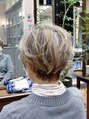 後ろに丸みを残した頭の形を綺麗に見せてくれるショートです。元々の白髪を活かした白髪ぼかしカラーで、ハイライトとローライトを混ぜてその人に出来ないオリジナルのデザインを作りました。