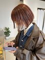ミニボブとオン眉のバランスが可愛いですカラーは毛先にブリーチが残っているので根本は暗めに染めて毛先は色がしっかり出るように楽しみながら伸ばしてる途中のスタイルです