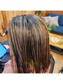 白髪がぼけるように、表面中心に細めのハイライトと、インナー部分もブリーチをして、少し派手目な白髪ぼかしです♪