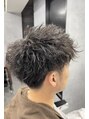 周りをすっきり刈り上げ、ジェットモヒカンベースにアイロンでツイストスパイラル風にアイロンパーマをかけて、動きを出したスタイル。髪が短くてロッドでは巻けないパーマでもアイロンならいけます!