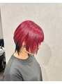 サイドを刈り上げたウルフカット、前髪ぱっつん。襟足は黒のままに残して、ブリーチしてから特殊カラーレッドをONカラー。デザインカット/特殊カラー/特殊カット/派手髪/派手髪姫路/派手髪兵庫県/バンギャヘア/V系ヘア/ロックヘア/赤黒デザイン