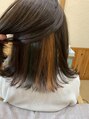 外ハネとくびれを作りやすいようにカットしています。カラーは全体はグレージュです。襟足部分にインナーとしてブリーチして、オレンジ、緑、青、紫と4色のカラーで染めています。あまり派手にはできないけど、少しカラーで遊びたいという方にオススメです!