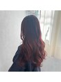 毛先はブリーチ毛なので彩度の強いチェリーレッドカラーに。あえて根元は伸びてきても馴染むようにグラデーションにして暗めのお色にしました。ロングなのでコテで巻いた時にやんわり巻くのがポイントです。
