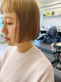 全体はミニボブで前髪は眉上のワイドバンクです。カラーはイエローベージュ!!ブリーチは2回ほどするのがお勧めですが1回でも近いところまではいけます。コテなど使わなくても可愛いを演出できるのこだわりのカットを施してます!!