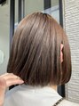 ギリギリ結べるアゴ下ラインの前下がりボブ♪ドライヤーだけでも自然に内に収まるので毎日のお手入れも簡単スタイル。明るめのグレージュカラーで赤味を抑えつつ、太陽に当たると透明感アップ♪