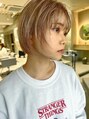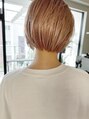 顔まわりを少し切り込んだ前上がりボブ。ブリーチをケアブリーチで優しく明るくしてピンクベージュに染めています。
