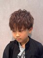 キッズでも刈り上げなしでオシャレに決まるパーマスタイルに。カラーはブリーチなしでできるアッシュブラウンで染めています、