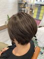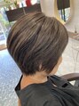 襟足ギリギリでコンパクトなショートスタイルに。多毛で硬毛のためツーセクションでタイトにメリハリを。カラーはオススメのブルーアッシュで白髪もぼかして透明感を!
