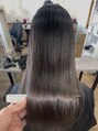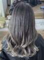 シルバーグレーに毛先ネイビーを重ねたデザインカラー。赤みを抑えて透明感を出し、色落ちまでキレイに見えるよう設計。