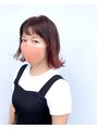 シンプルな前髪ありの切りっぱなしボブ。全体にハイライト、毛先はブリーチで明るくし、上から赤紫強めのピンクをのせます。※ハイライトやブリーチをご希望の方はお電話にてご確認ください。