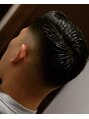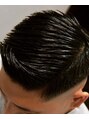 サイドの張りが強く出る骨格と毛質なのでハイフェードに設定。力強い毛流れはセニングを入れずに面を意識したカットラインになっています。スタイリングは艶強めのハードなグリースを撫でつけコーミング。