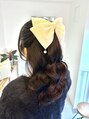 お呼ばれやライブにぴったりの韓国アイドル風ハーフアップ◎ボリューミーでツヤと立体感が出るような巻き方はおまかせください♪前から見ても華やかでカワイイ大きなリボンをつけるのがおすすめ。