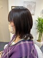 肩に当たって自然に外はねになるボブスタイルです。後頭部にレイヤーを入れて自然な丸み、ボリューム感をプラス。骨格に合わせてボリュームの位置を調節するので、頭の形良く見せることができ、小顔見せにおすすめヘアです。