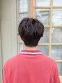 王道のマッシュスタイル。刈り上げずに襟足は少し長さを残してタイトめにカット。前髪は目にかかるくらいの少し長めの設定なのでおしゃれな雰囲気の出る稍重目スタイルです。わけてセンターパートにしても成立する2wayスタイルです。