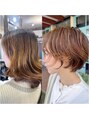 前回やった部分の色が抜けてほぼ金髪になって痛みも気になるとの事なので今回はバッサリイメチェンふわふわ丸みショートにしました(^^)バームで仕上げてますが、ムースで仕上げても可愛いスタイルです♪