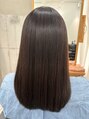透明感と深みを両立したスタイル。光が当たるたびにツヤが均一に見えるよう縮毛+プレミアムTrで整えながら丁寧に施術しています。赤み系カラーでも重くならず、ストレートの美しさが引き立つ上品な色味。乾かすだけでまとまる、なめらかに仕上がっています。
