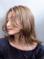 顔周りレイヤーとフェイスラインの大きなSカールがポイントのミディアムスタイルです。頬にかかる毛束と首元がくびれるシルエット。前髪はフワッとかきあげて、抜け感と透明感のある仕上がりに。