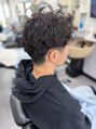 横と後ろはスッキリと刈り上げて前髪は目にかからないぐらいの長さで強さも絶妙なツイストスパイラルパーマです。オイルやグリースを揉み込むだけで完成します。