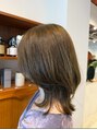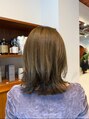 毛量が多く、トップが潰れてしまうことがお悩みのお客様です。4cmほど長さを切らせていただき、トップにレイヤーを入れてサイドが流れるようにカットしています。ヘアカラーは今季の流行色のパープルブラウンでカラーリングしています。