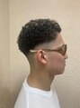 細かめクリクリパーマ。刈り上げはスキンフェード0ミリ使用でスッキリ仕上げました。スタイリング剤はウォーター系のモノ、グリースなどでセットのスプレー仕上げです。