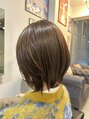 首元にくびれをつくった立体ショートボブ。トップは自然な丸みを残し、襟足はタイトに締めて横顔を美しく見せるシルエットに。赤みを抑えたモカブラウンで透明感と艶をプラスし、上品で大人可愛い印象に仕上げました。