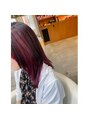 ブリーチの履歴を活かしてツートーンのアンブレラカラー◎分け目から左右3センチは暗くして、内側にレッドバイオレットを濃いめに入れました◎オージュアは、タンパク質が不足しているのと水分保持力もキープしたいので、リペアリティとクエンチを使用。