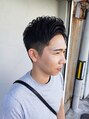 サイドとバックは刈り上げ、トップは黒髪に艶感のある束感と毛流れを出しスタイリングした、大人のショートスタイル。