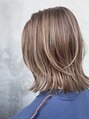 レイヤーが入った肩に付く位のロングボブです、切りっぱなし感もあり、レイヤーで動きもあるスタイルになっております。カラーはハイライトでスモーキーベージュをオンカラーしております。