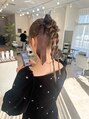 オケージョンヘアスタイルタイトめにピタッと上めであげたスタイルにねじりカチモリ風でロープ編み垂らすかわいいアレンジ