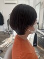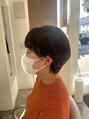襟足にレイヤーカットを入れ軽さをつくり首に沿わせています。全体にはグラデーションで丸みをつけるマッシュショートになっています。質感調整で縮毛矯正の質感を和らげるためにしっとりふわっと見えるカットをして動いた時も収まりよく仕上がります。
