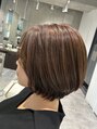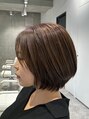 ブリーチなしのダブルカラーで根元からふんわり明るさを出し、オンカラーで柔らかい透明感をプラスした甘かわいいショートボブ。自然な丸みと軽さで、横顔がすっきり見える大人可愛いスタイルです。