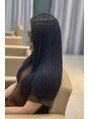 深みのあるブルーカラーを活かした艶感ストレート毛先までまとまりのある仕上がりで、透明感と大人っぽさを引き立てます。光に当たると柔らかく輝き、上品で洗練された雰囲気に。