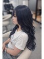 深みのあるブルーブラックカラーで、透明感とツヤ感を最大限に引き出した韓国風ロングスタイル。顔まわりから毛先にかけて大きめのヨシン巻きを入れることで、重く見えがちなダークカラーでも軽やかで可愛い印象に。
