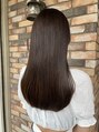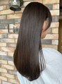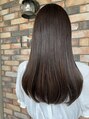 やや前上がりの艶髪ロング。重めにするとよりツヤ感とまとまりが。軽めにすると束感と動きが出しやすくなります。髪質やお悩みに合わせて重めか軽めか提案させていただきますのでご相談ください。