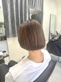 ボブ切りっぱなしのボブスタイル内巻きにも外巻きにもできてその日の気分に合わせてスタイリング可能ですヘアカラーは重く見えないベージュカラーで柔らかく透明感の高い色味白髪染めや白髪ぼかしにも可能です是非ご相談ください