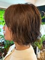 ショートからボブに伸びた髪にゆるめのパーマをかけて明るめのオリーブベージュで染めました。ムースでウエットにスタイリングするとパーマ感がアップします。