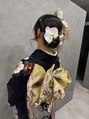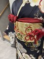 成人式当日の振袖着付けです。髪はシンプルにツヤっとシニヨンでまとめ、前から花と金箔が見えるように飾り付けをしました。帯はリボンみたいな形がいいとのことだったので、舞立立て矢にしました。