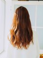 毛先は軽めに作った人気のロングスタイル。表面のツヤを生かすためレイヤーはあまり入れずに仕上げています。スタイリングは表面をポイントでウェーブ巻きにし、軽く動きをつける程度。オイルを全体に馴染ませツヤを足しました。
