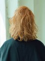 鎖骨あたりで切りそろえたワンレングスのミディアムボブ。スタイリングは太めのコテでリッジ強めに巻いてクールな雰囲気に。まろやかなベージュ系のハイトーンカラーと毛先は内巻きにすることで柔らかさをプラスしています。