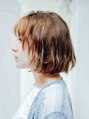 ボブスタイルの表面にうねりを付けて軽い印象に!カラーリングも透け感があるベージュブラウンにして全体的に柔らかい印象に!前髪はシースルーで抜け感を出しました。スタイリングはシアバターを軽く揉みこみ束感をつくりました。