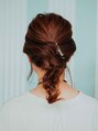 編み込みやすいように全体の毛先を巻き、シアバターなどの柔らかいスタイリング剤をまんべんなく付けます。始めはしっかり編み込んでから緩く見えるように引き出していきます。毛先は丸めて結び、顔周りの後れ毛にニュアンスを付けて完成です
