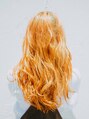 ヘアカラーは夏っぽくオレンジカラーにしています。スタイリングは、太めのコテを使って全体的にウェーブ感が出るように巻いています。前髪をかきあげると大人っぽい雰囲気を出すことができます。