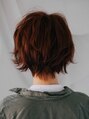 顔周り長めのショートボブスタイルです。襟足は首が出るくらいの長さで、頭の丸みが綺麗に出るようにすっきりとさせました。カラーリングは全体にランダムにハイライトを入れ、ビビットなレッドがアクセントになるようにしました。