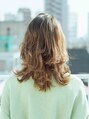 全体にくびれるようにウェーブをつけたかきあげフェミニンスタイルです。ベースを外ハネワンカールにすることで、すっきりとしたシルエットを保ちながらウェーブスタイルになります。