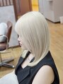 ハイトーンカラーの顔周りレイヤースタイル!18レベルまでリフト後ホワイトニングしてホワイトブロンドに。仕上げはストレートアイロンで軽く内に流してLoaオイルを使用。