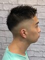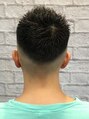 もみあげ~えりあしにかけてはフェードでスッキリと。上はブロックにせず繋がる感じで短くして、毛先はすいてジェルで立たせました。